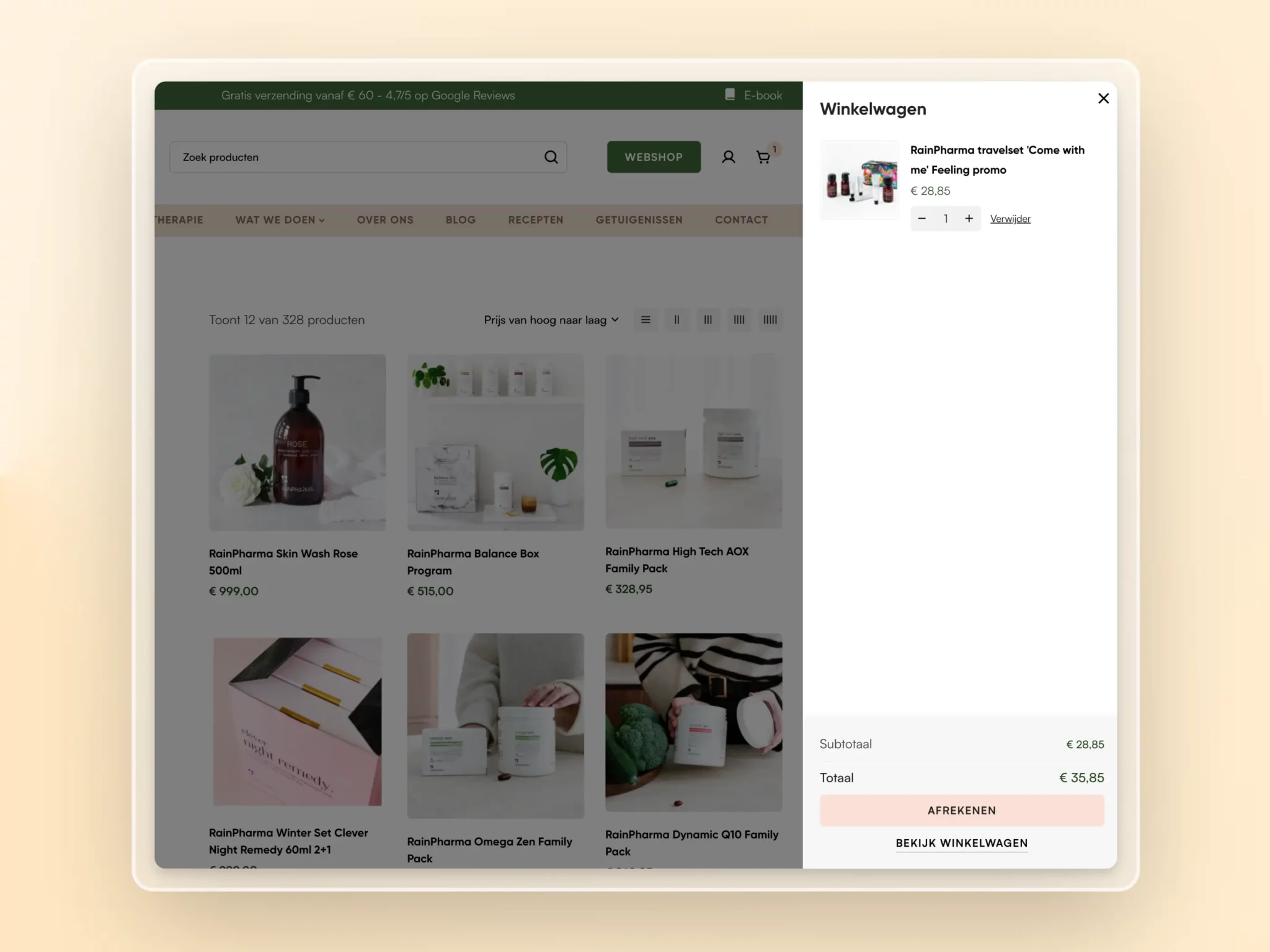 Het winkelmandje opent dynamisch aan de zijkant van het scherm, zodat we klanten niet onnodig wegsturen van belangrijke pagina’s. Heel handig in gebruik en een technologie die we meer en meer gebruiken bij het bouwen van webshops.