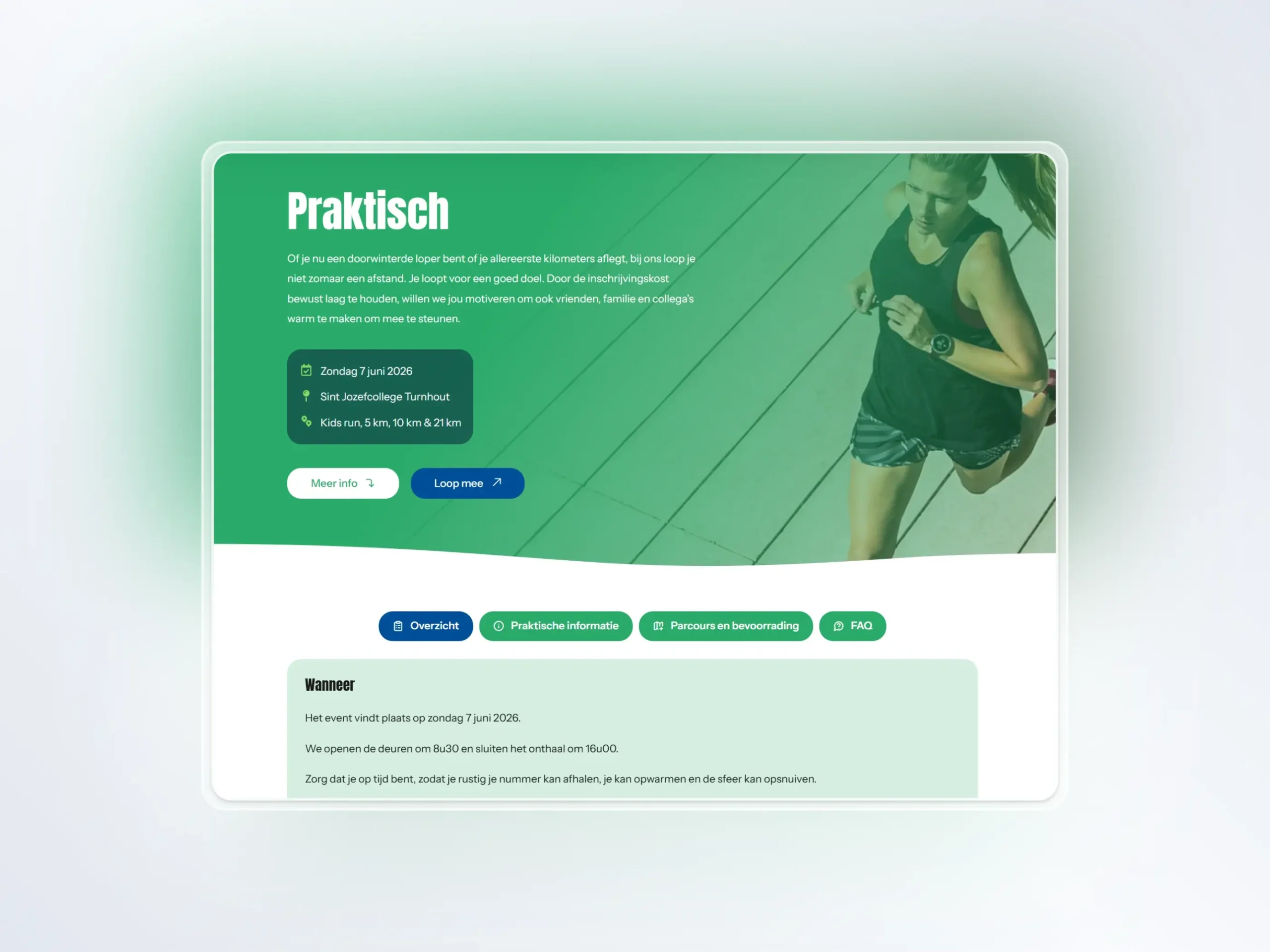 Deelnemers willen snel weten: wanneer, waar, hoe laat en hoe schrijf ik me in? Alle praktische informatie over de run staat gebundeld op één pagina met een duidelijke structuur. Geen zoekwerk, geen clicks te veel.