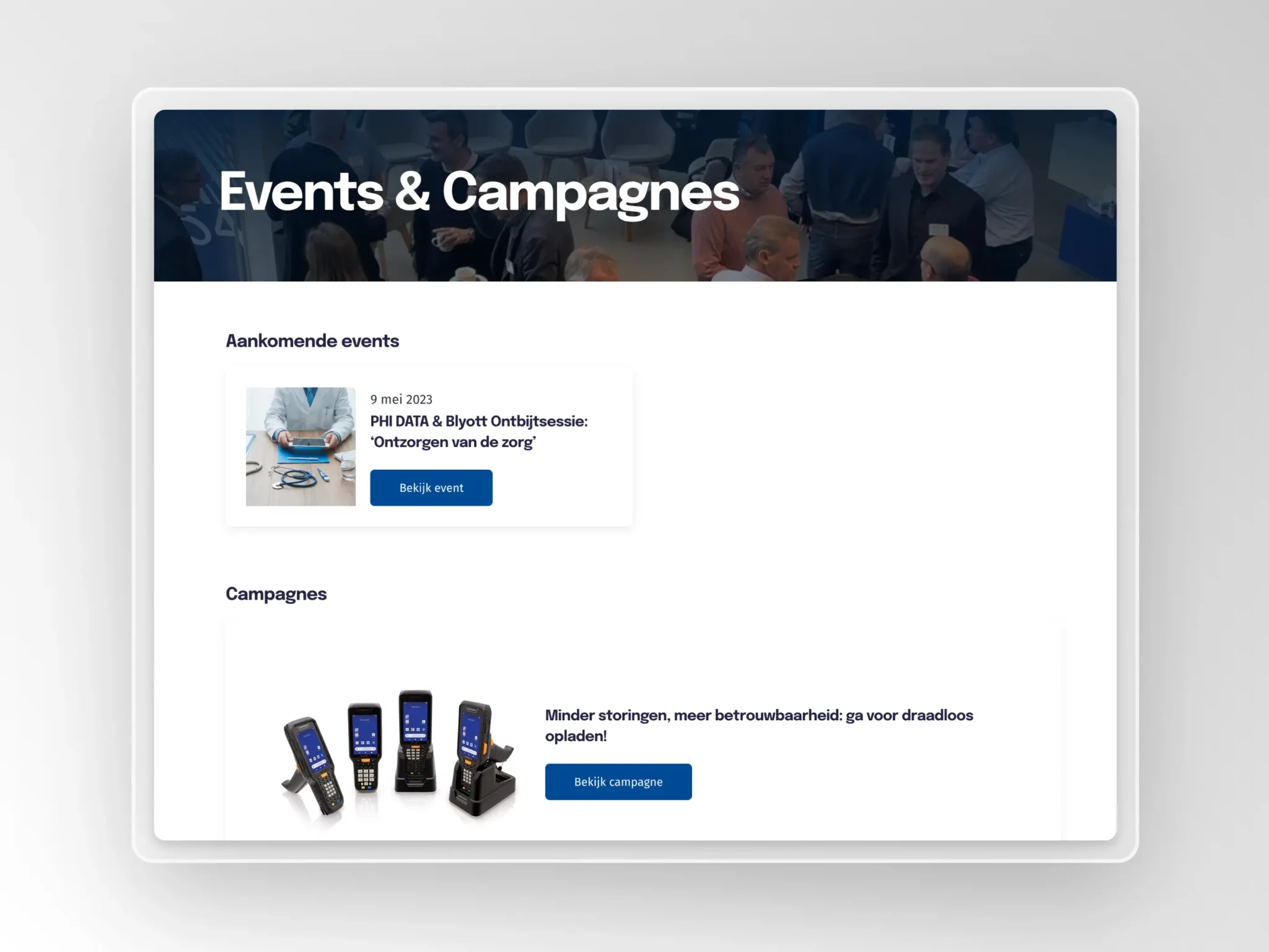 Het events-systeem geeft PHI DATA de mogelijkheid om te laten zien op welke evenementen en beurzen ze aanwezig zijn, waardoor potentiële klanten gemakkelijk met hen in contact kunnen komen en meer over hun oplossingen kunnen leren.