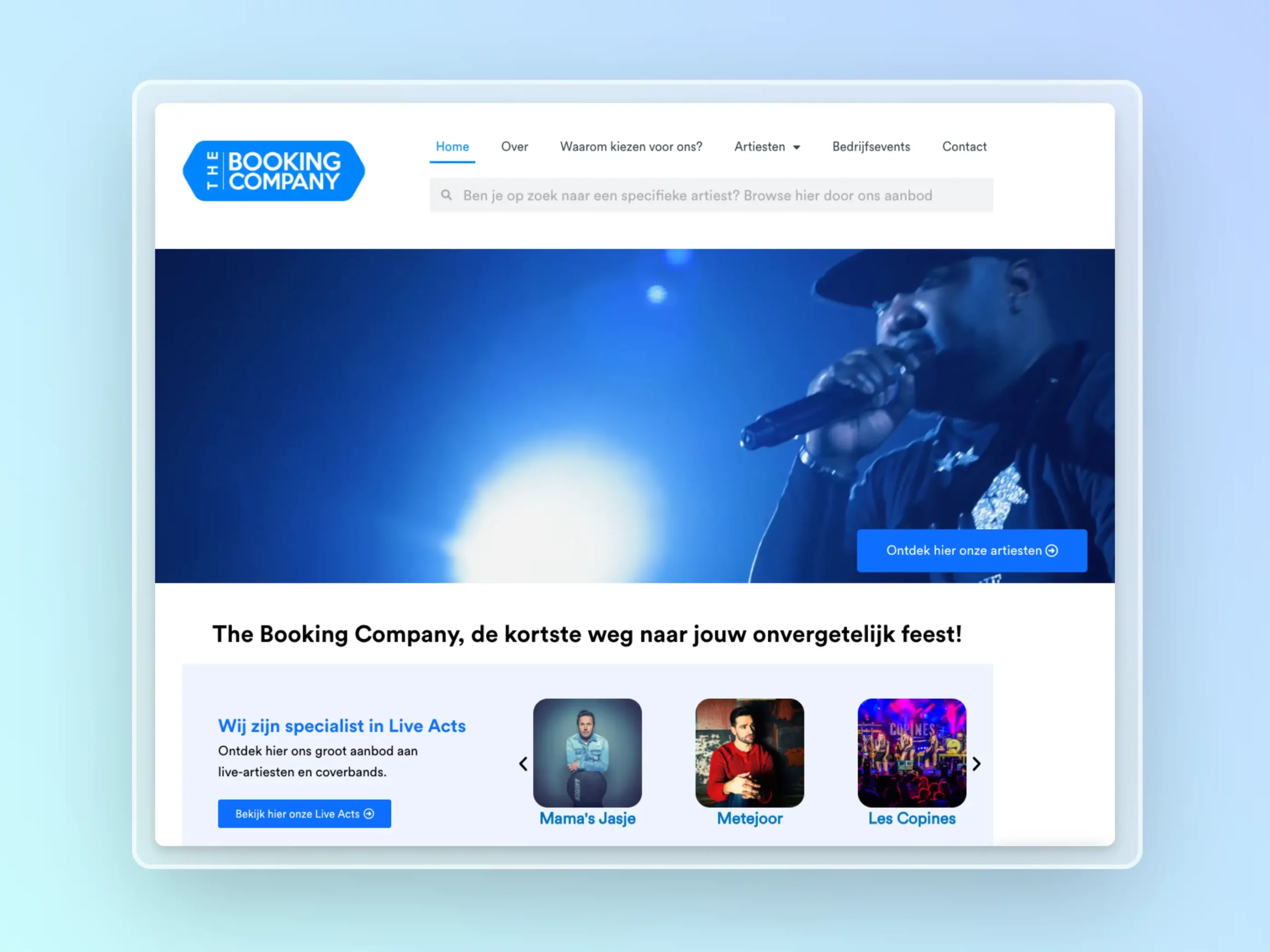De homepagina van The Booking Company trekt meteen de aandacht met een boeiende video en een voorproefje van hun brede aanbod aan artiesten. Je krijgt onmiddellijk een gevoel van wat het bedrijf te bieden heeft!