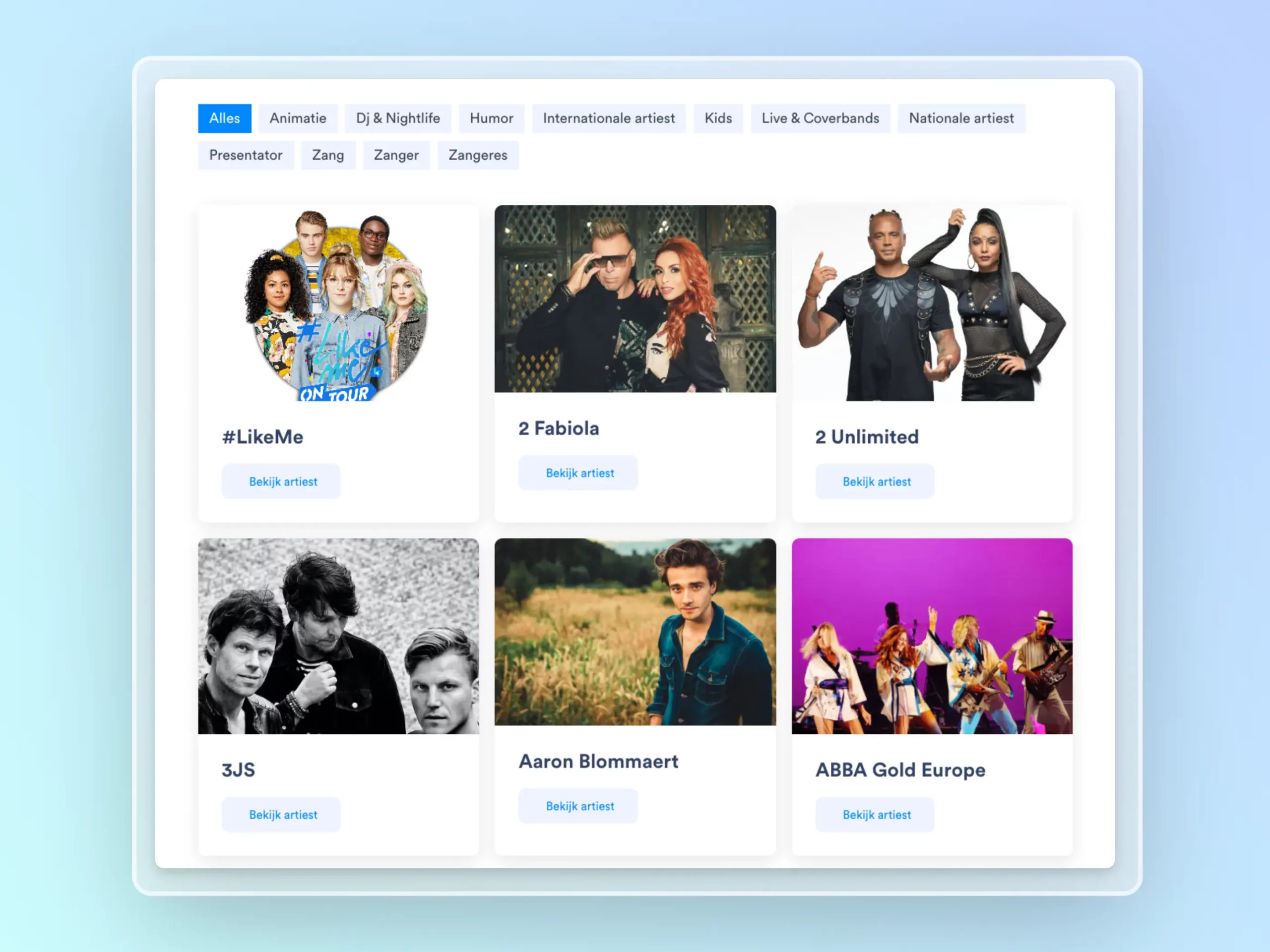 The Booking Company biedt een uitgebreid aanbod aan artiesten aan. Op de artiestenpagina kan je eenvoudig filteren op categorieën zoals DJ’s, zangers of animatie, om zo snel jouw perfecte match te vinden voor je evenement.