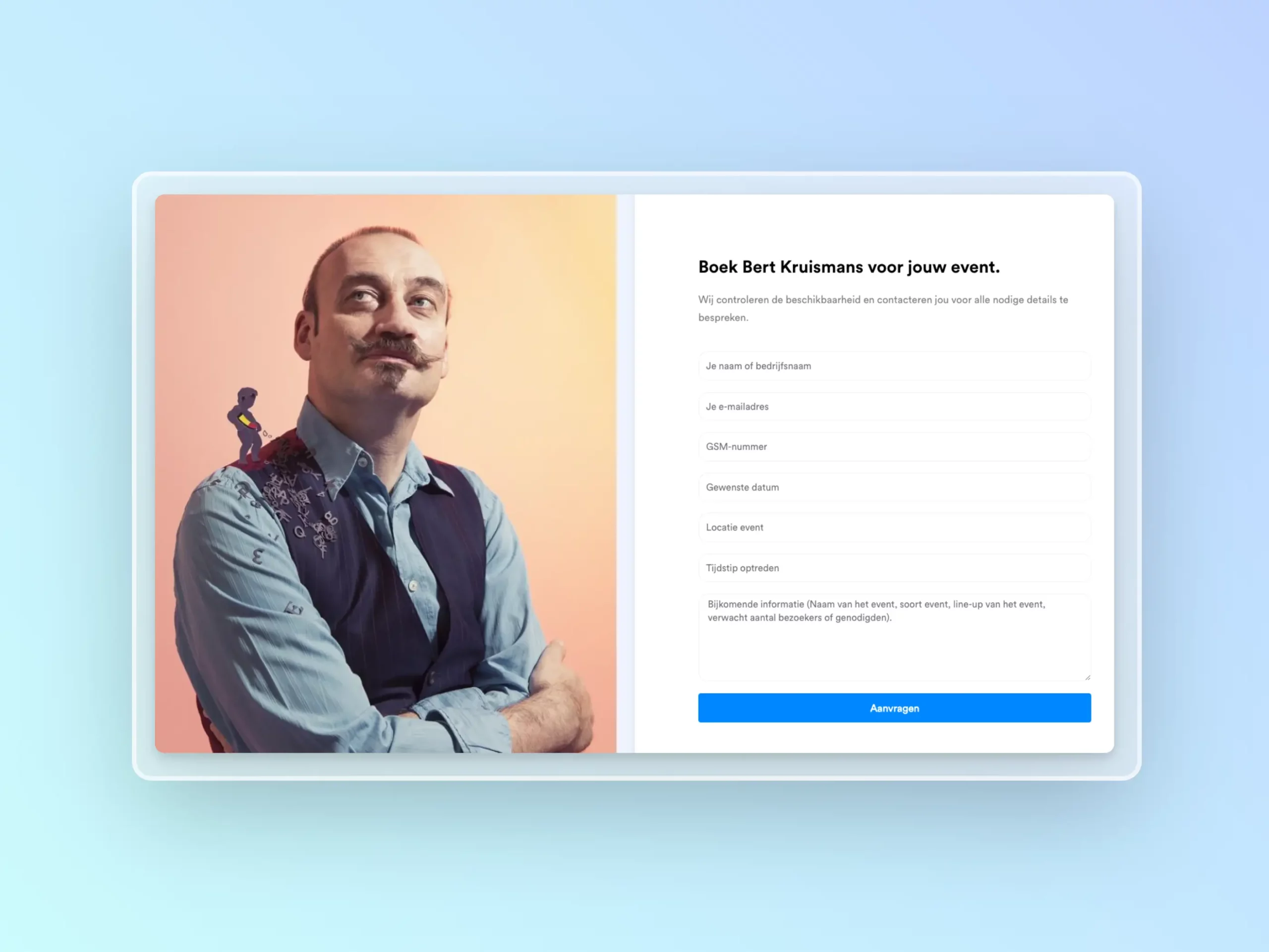 Voor elke artiest kun je via een eenvoudig formulier een boekingsaanvraag indienen. Op de artiestenpagina krijg je een duidelijk beeld van de artiest via video’s, beschrijvingen en prijzen.